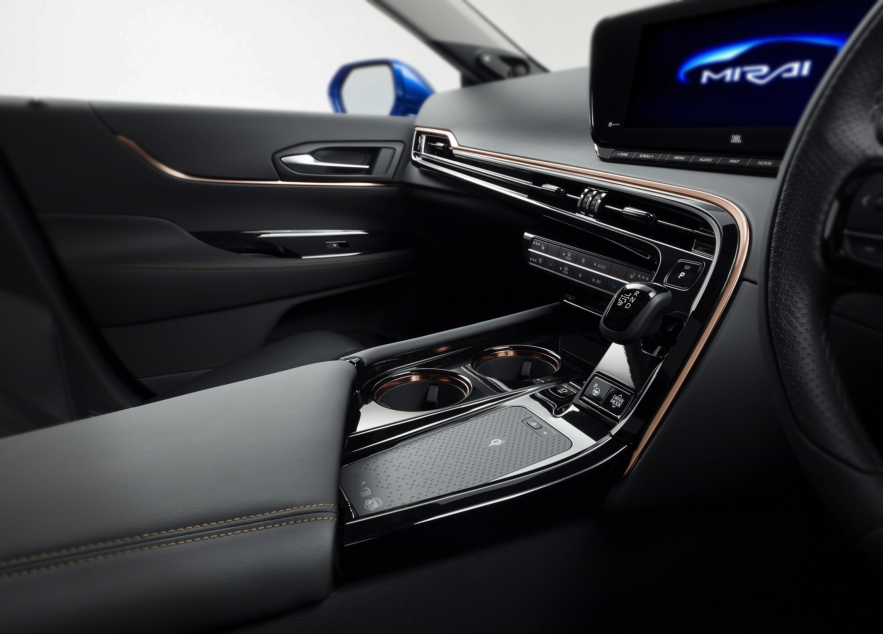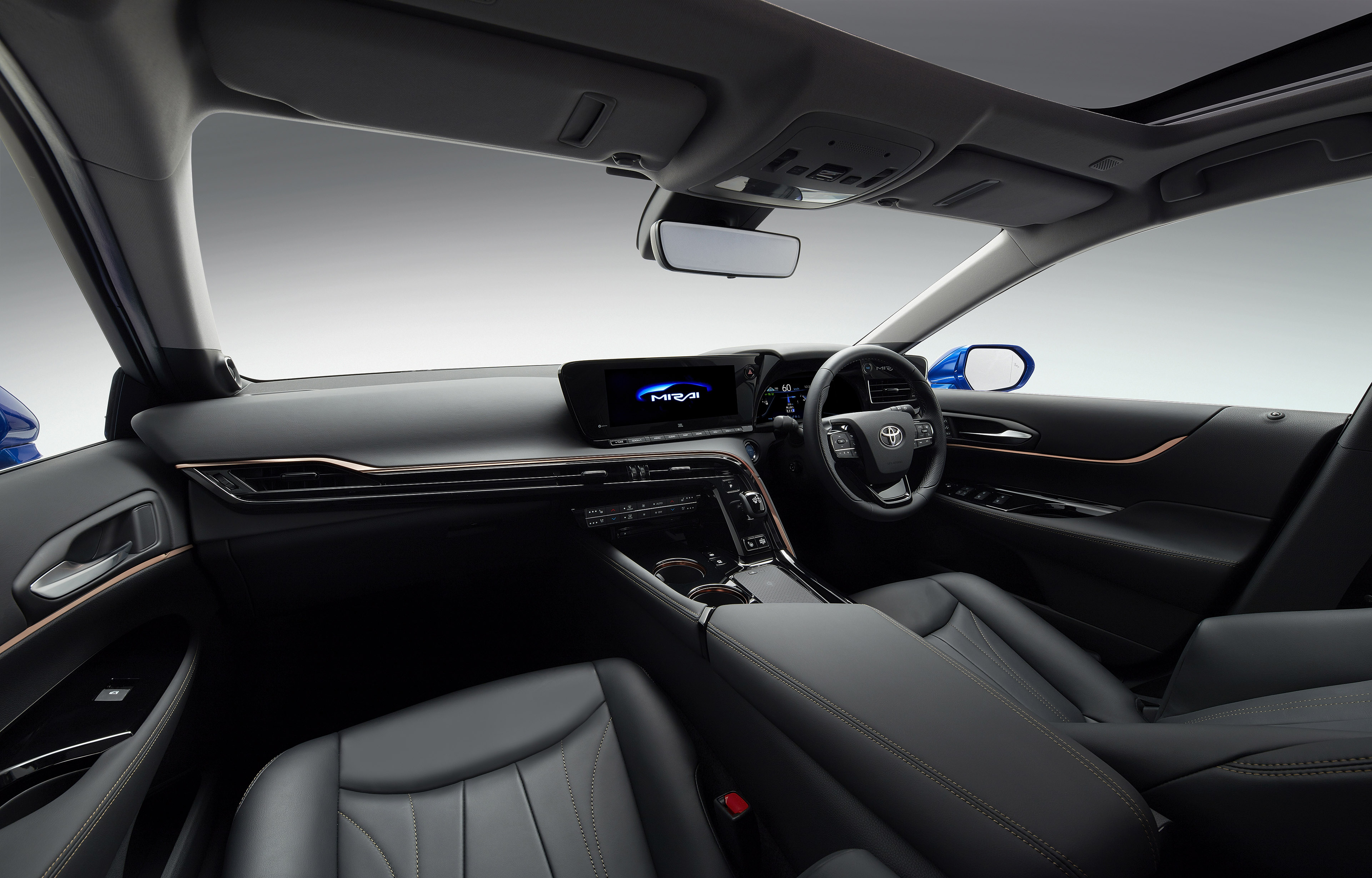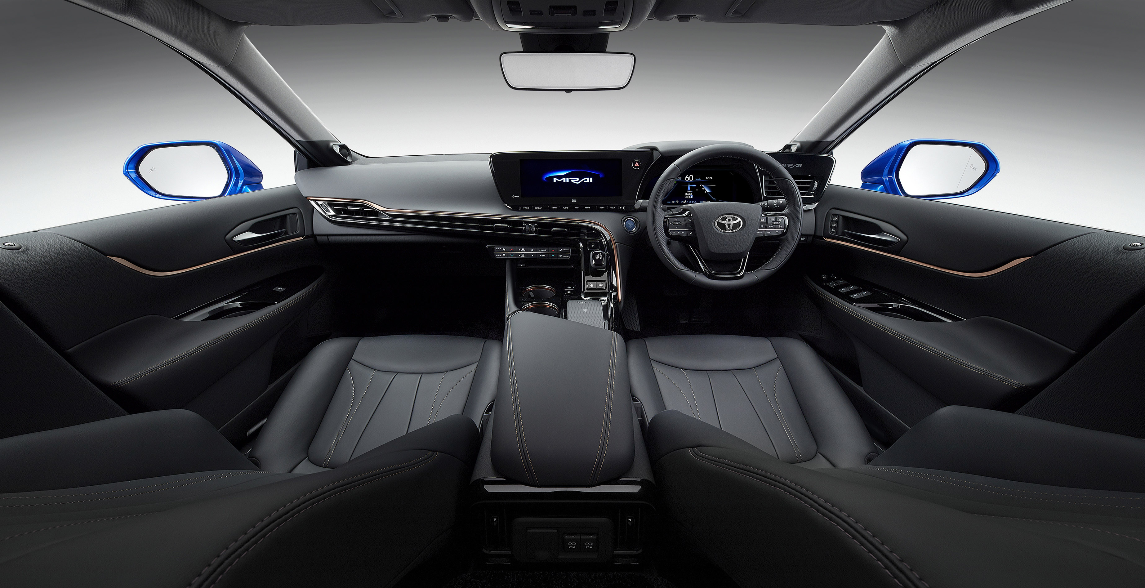De nieuwe Toyota Mirai is direct te herkennen aan zijn onderscheidende exterieurdesign. Met zijn lage lijnen, elegante proporties, gestroomlijnde carrosserie en grote 20-inch wielen, heeft de Mirai een krachtige en herkenbare look. Het exemplaar op de Tokyo Motor Show is gespoten in een nieuwe speciaal ontwikkelde diepblauwe kleur. Die bestaat uit meerdere laklagen en heeft een uitzonderlijke helderheid. In het rustige en moderne interieur heerst een warme, comfortabele sfeer die het gevoel geeft dat dit een auto is waarmee het uiterst aangenaam reizen is. Belangrijke elementen die hieraan bijdragen zijn een 12,3-inch centraal display en een instrumentenpaneel dat zich als het ware om de bestuurder heen vouwt. In tegenstelling tot de huidige Mirai biedt de nieuwe generatie genoeg ruimte voor vijf inzittenden.