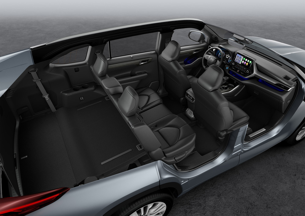 De bagageruimte van de Toyota Highlander is met de 3e zitrij neergeklapt 658 liter groot. De achterklep laat zich eenvoudig op afstand bedienen met een voetbeweging onder de auto. Door ook de tweede zitrij neer te klappen, is de bagageruimte uit te breiden tot maar liefst 1.909 liter. Door het hele interieur zijn meerdere opbergruimtes te vinden. Zowel voorin als bij de tweede zitrij bevinden zich USB-aansluitingen.