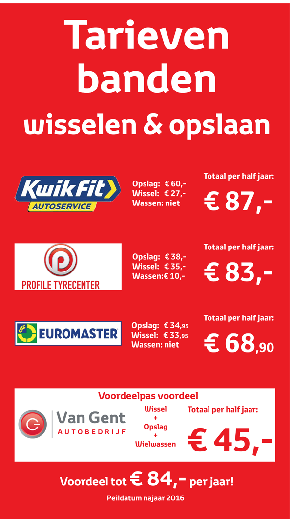 Al enige jaren biedt Van Gent haar trouwe klanten een uniek voordeel: gratis wielenwissel bij opslag. Zij betalen slechts € 45,- voor opslag, wissel én wielwassen per half jaar. Dit scheelt al gauw meer dan € 80,- per jaar met concurrerende bandenfitters!