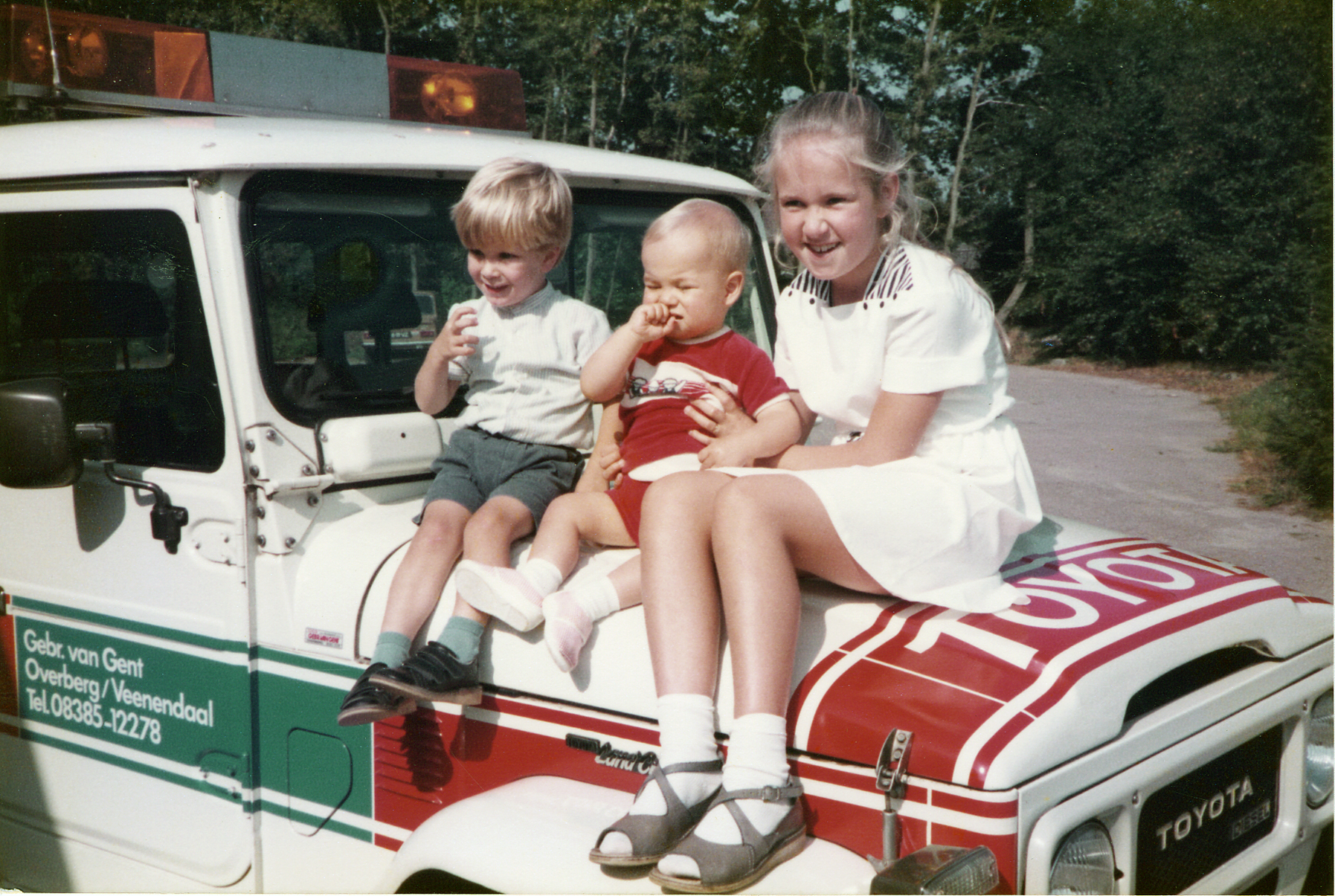Ook de familie Van Gent groeit. En de jeugd wordt het autovak en het merk Toyota met de paplepel ingegoten. Op deze plaat ziet u vlnr: Diderik, Gilbert en Edith op de Land Cruiser serviceauto.
