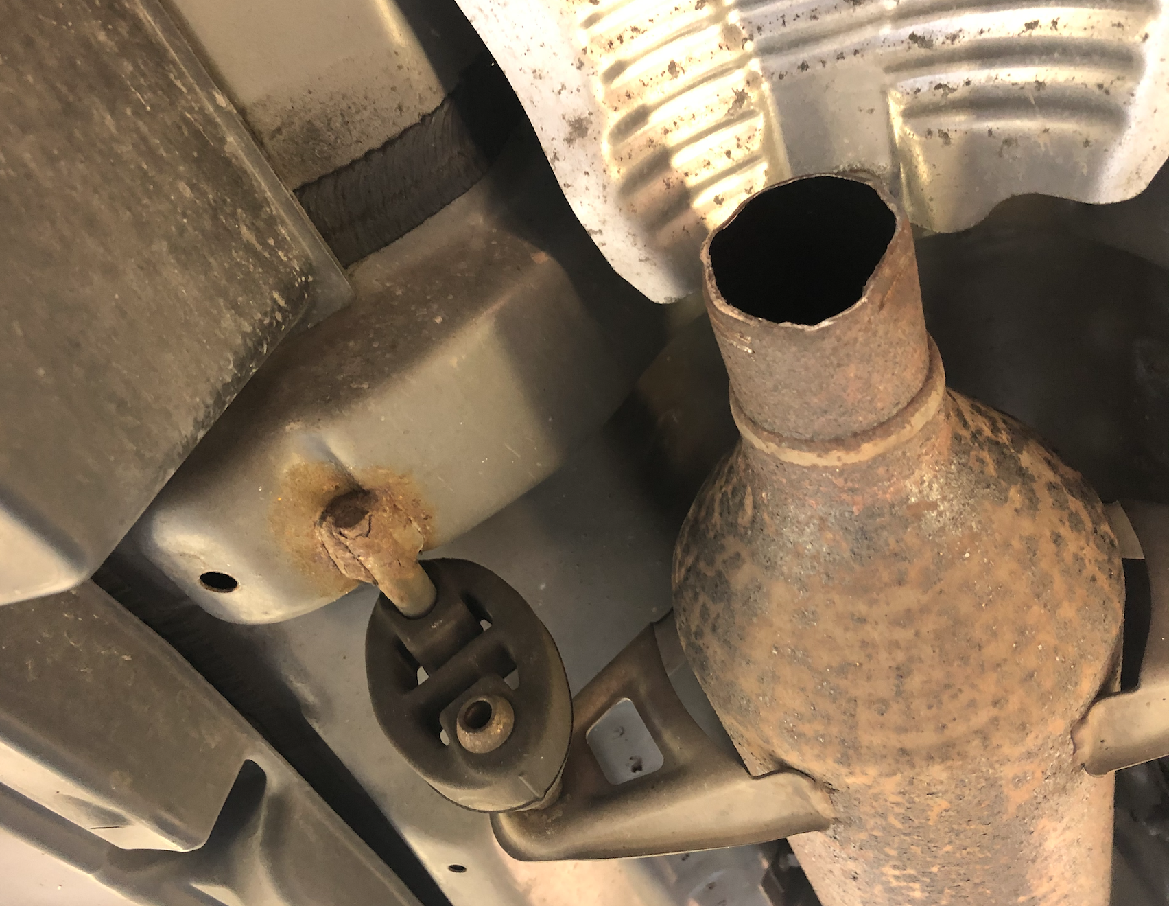 Foto: uitlaat waar de katalysator tussenuit gehaald is